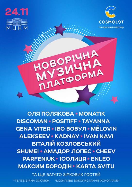 24 листопада 2023 року в МЦКМ “Жовтневий палац” відбудеться концерт “Новорічна музична платформа”. В цей вечір прозвучать пісні, які наразі вважаються найкращими та найпопулярнішими в Україні.